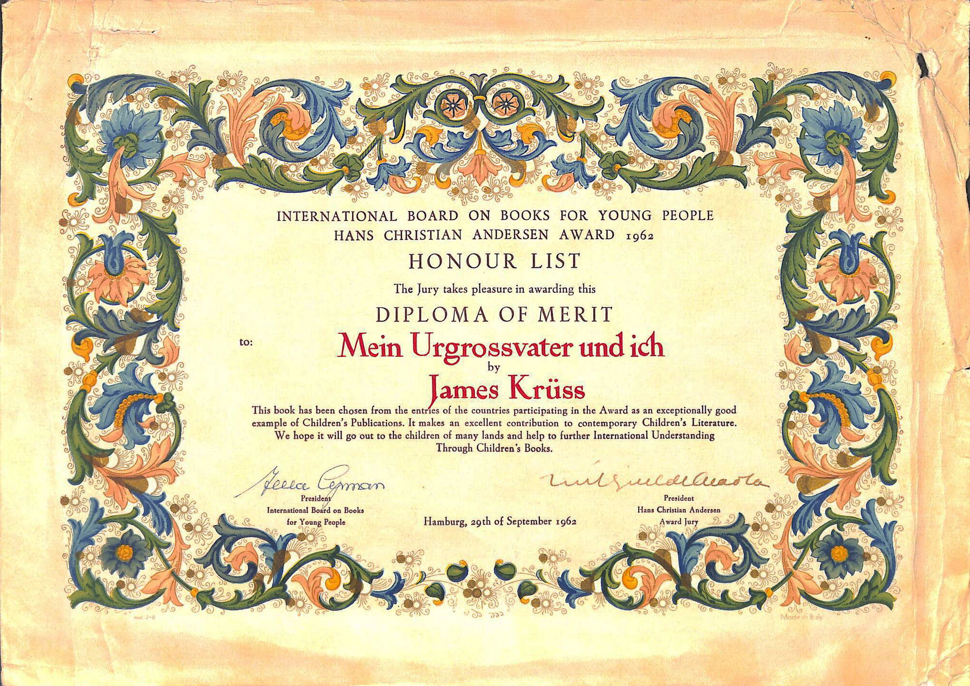1968 erhielt James Krüss – auf dem Höhepunkt seiner Karriere – für sein Gesamtwerk den Hans-Christian-Andersen-Preis. Der Preis ist nach dem dänischen Schriftsteller Hans Christian Andersen benannt und gilt als die wichtigste internationale Auszeichnung für Kinderbuchautoren und -illustratoren und neuerdings auch für Übersetzer. Deshalb wird dieser Literaturpreis auch als »kleiner Nobelpreis« bezeichnet. Der Preis ist undotiert, also ein reiner Ehrenpreis, und wird in Form einer Goldmedaille mit dem Konterfei des dänischen Namensgebers alle zwei Jahre in Andersens Geburtsstadt Odense überreicht. Ausrichter ist das IBBY (International Board on Books for Young People), ein international besetztes Kuratorium. Schirmherrin ist die dänische Königin Margrethe II.
